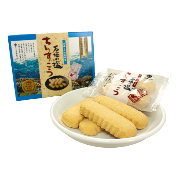 美しいサンゴに恵まれた海水を低温加熱製法で精製する事によって生まれた石垣島の塩を使用することでちんすこう本来の味を引き立て更に従来のちんすこうの原材料配合よりラード、砂糖を抑え甘さ控えめで優しい味に仕上げました。